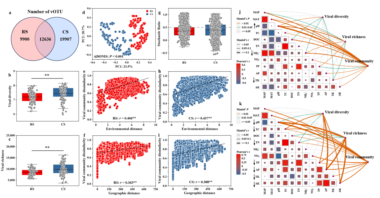 为此,东北地理所农田分子生态学科组研究人员大范围采集了典型黑土带的水稻土和毗邻的玉米地土壤,利用宏基因组测序技术,解析了水田(RS)和旱作土壤(CS)病毒群落地理分布格局及病毒携带ARGs的传播机制和生态策略。
