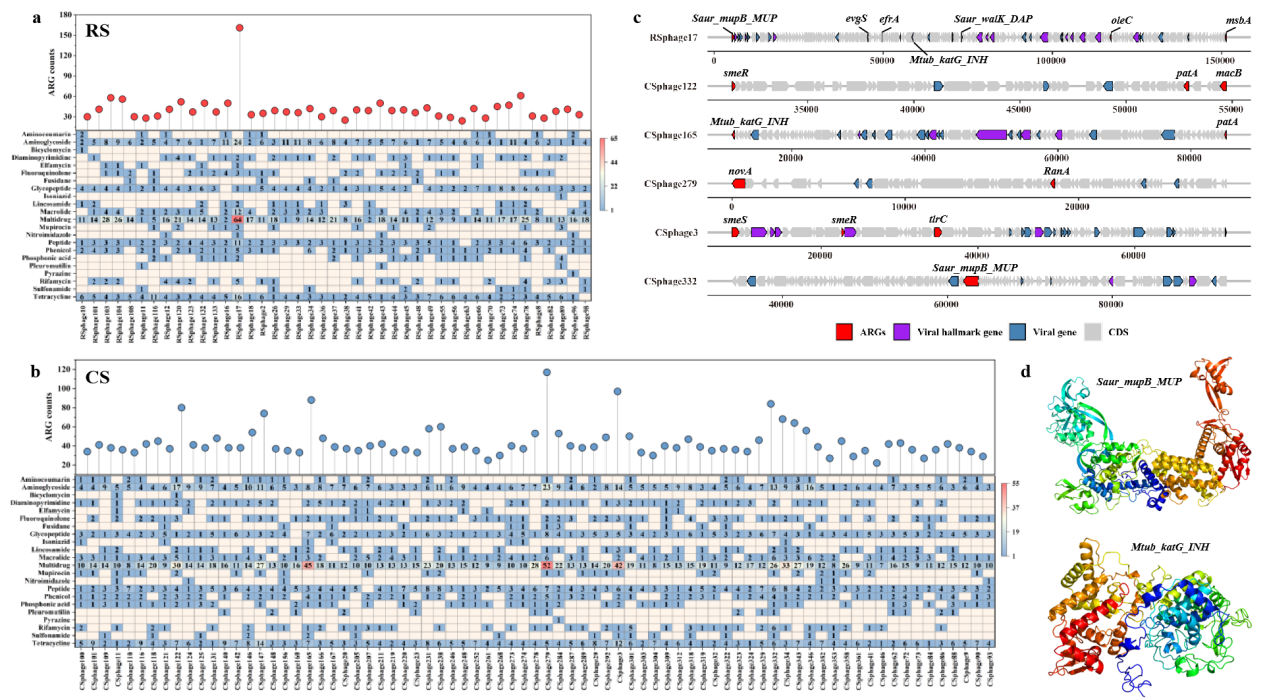 研究表明,东北黑土带土壤病毒群落存在显著距离衰减模式。与RS相比,CS中的病毒群落具有更高的群落多样性和差异显著的群落结构,但RS和CS中的病毒群落并不具有维度多样性梯度格局(图1)。土壤pH是决定病毒群落分布的主要因素,而较高的土壤养分含量显著降低病毒群落多样性。Uroviricota、Nucleocytoviricota和Artverviricota是农田土壤中的主要病毒门,同时发现病毒群落的宿主涉及包括放线菌、变形菌等在内的17个原核微生物门。此外,我们在RS和CS中检测出了27类抗生素抗性类型,其中多重耐药型在黑土中的占比最高。结合病毒群落数据发现,RS和CS中携带ARGs的病毒数分别占总群落的9.61%和11.4%。进一步拼接构建环状噬菌体基因组发现,RS中的溶原噬菌体携带了29.7%的ARGs,明显高于CS中的12.5%,而CS中携带ARGs的病毒主要为烈性噬菌体(图2)。本研究揭示了黑土带区域尺度上的两类农田土壤中病毒和抗生素抗性基因的分布特征及病毒携带ARG的裂解溶原策略。