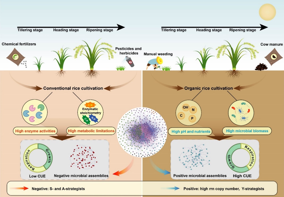 有机农业作为一种环境友好型农业管理方式,在提升土壤健康和促进可持续农业发展方面受到广泛关注。然而,有机种植如何通过调控土壤微生物群落提升碳利用效率(CUE),进而增强土壤碳汇功能,其机制尚不清晰。近日,东北地理所农田分子生态学科组在东北黑土区科研人员系统比较了长期有机与常规两种水稻栽培模式下,土壤微生物CUE在水稻生育期内的动态变化,并结合土壤理化性质、微生物群落结构、酶活性及生态化学计量学特征,深入解析了微生物CUE驱动土壤有机碳动态的特征与机制。