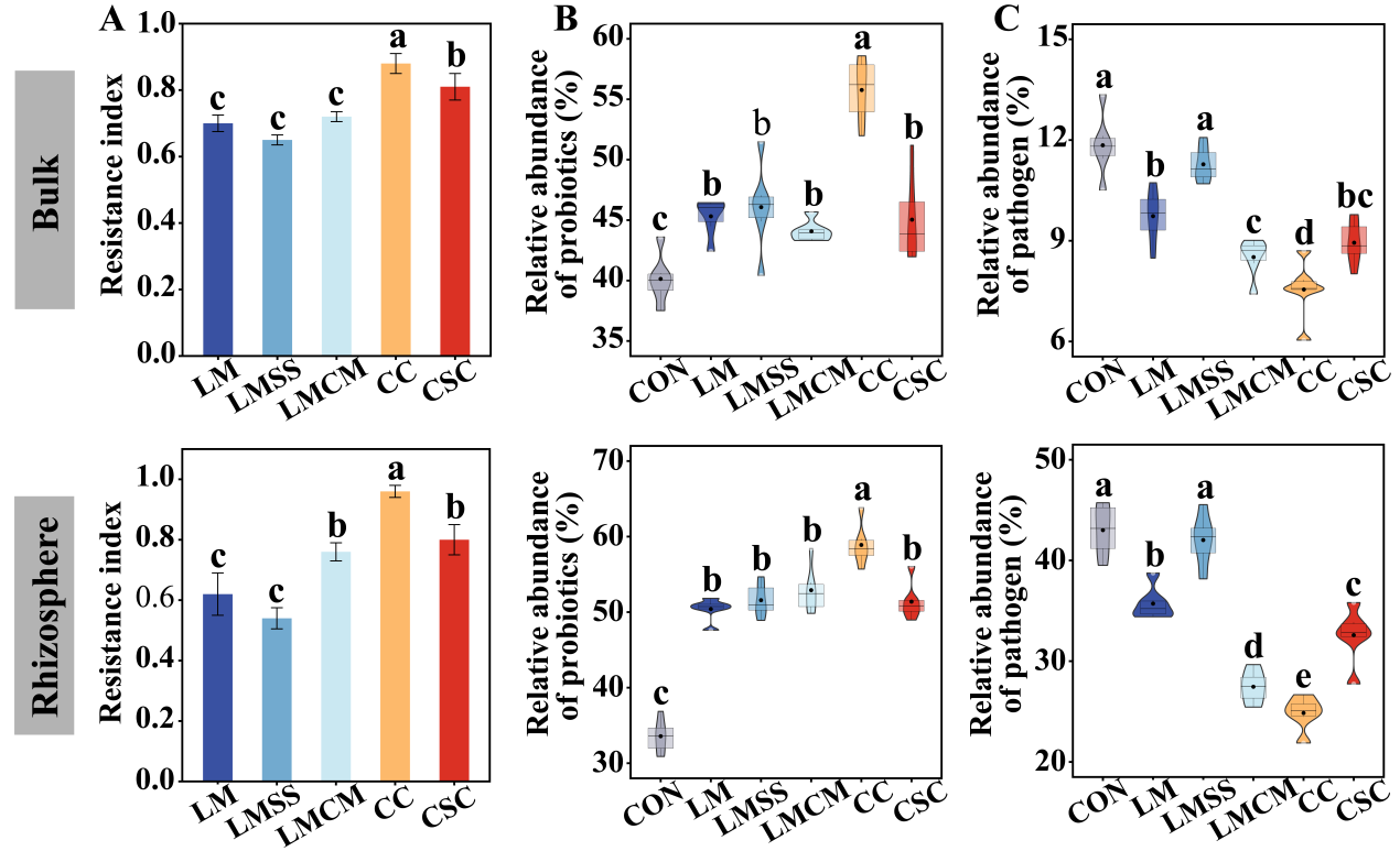 基于海伦水土保持监测研究站的田间定位试验平台,设置了对照(CON)、石灰(LM)、石灰秸秆配施(LMSS)、石灰牛粪配施(LMCM)、2%粗甲壳素(CC)及硅钙钾镁肥(CSC)6种改良处理,系统评估了其对土壤性质、微生物群落、大豆根腐病发病率及产量的影响。结果显示,改良剂能有效降低大豆根腐病发病率和提高大豆产量,其中CC抑病和增产效果最大,根腐病发病率降低70%,产量提高30%以上。土壤改良剂显著富集了具有抑病和促生功能的潜在有益物种,如Pantoea、Bacillus、Humicola、 Tausonia和Mortierella,同时减少了潜在病原菌(图1)。体外共培养实验进一步验证,改良土壤的根际细菌悬液明显抑制了病原菌菌丝的生长,且该抑病能力与富集的有益菌丰度呈显著正相关(图2)。土壤改良剂,特别是CC处理诱导了最高的微生物抗性,证实改良剂能够通过诱导健康的微生物区系来缓解连作障碍(图3)。本研究明确了“改良剂-微生物抗性-病害抑制-产量提升”的级联调控路径,为维持土壤健康和促进作物生产提供了理论依据。