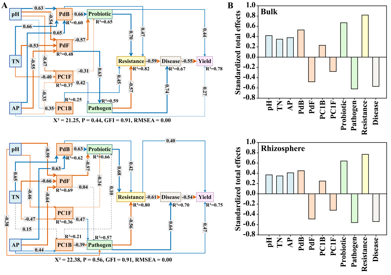 图3改良剂介导的土壤性质和微生物群落特征与抑病能力及大豆产量的互作关系