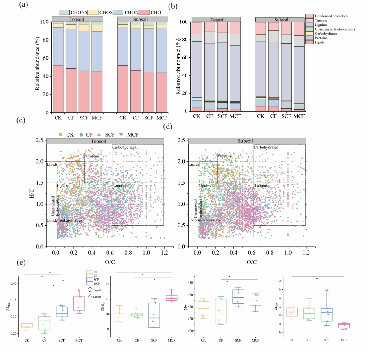 东北地理所黑土保护与利用学科组科研人员依托中国科学院海伦农业生态实验站34年长期定位试验,系统研究了有机物料(秸秆和粪肥)配施化肥下,黑土表层(0-20 cm)和底层(20-40 cm)MNC含量变化,同时结合土壤理化性质、微生物群落结构、DOM的分子特征,深入解析了MNC积累的驱动机制。研究结果表明,秸秆和粪肥处理使表层(0-20 cm)MNC含量分别增加了31.6%和38.2%,亚表层(20-40 cm)分别增加了20.0%和35.6%。有机物料还田通过热力学限制过程将易降解DOM组分转化为稳定性DOM,导致DOM的降解由细菌的快速分解转为较慢的真菌代谢过程。秸秆处理主要通过改变DOM的分子量提升真菌网络模块化程度,驱动真菌残体碳积累;有机肥处理则通过增加DOM芳香度富集特定细菌类群,促进细菌残体碳积累。进一步研究发现,表土MNC的积累与土壤性质、DOM质量和微生物群落共同调控,而底土MNC对DOM质量的依赖性更强。本研究明确了DOM在微生物介导的MNC积累中的核心地位,并建立了DOM特性与农业管理策略之间的机制性关联。