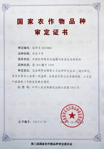 我所培育出的大豆品种”东生9号”获得农业部国家农业作物品种审委员会颁发的国家农业作物品种审定证书,这是我所培育的大豆东生系列品种第三个获得国家农业作物品种审定证书,审定编号:国审豆2013004。公告号:中华人民共和国农业部公告第2011号,证书编号:2013-1-70。