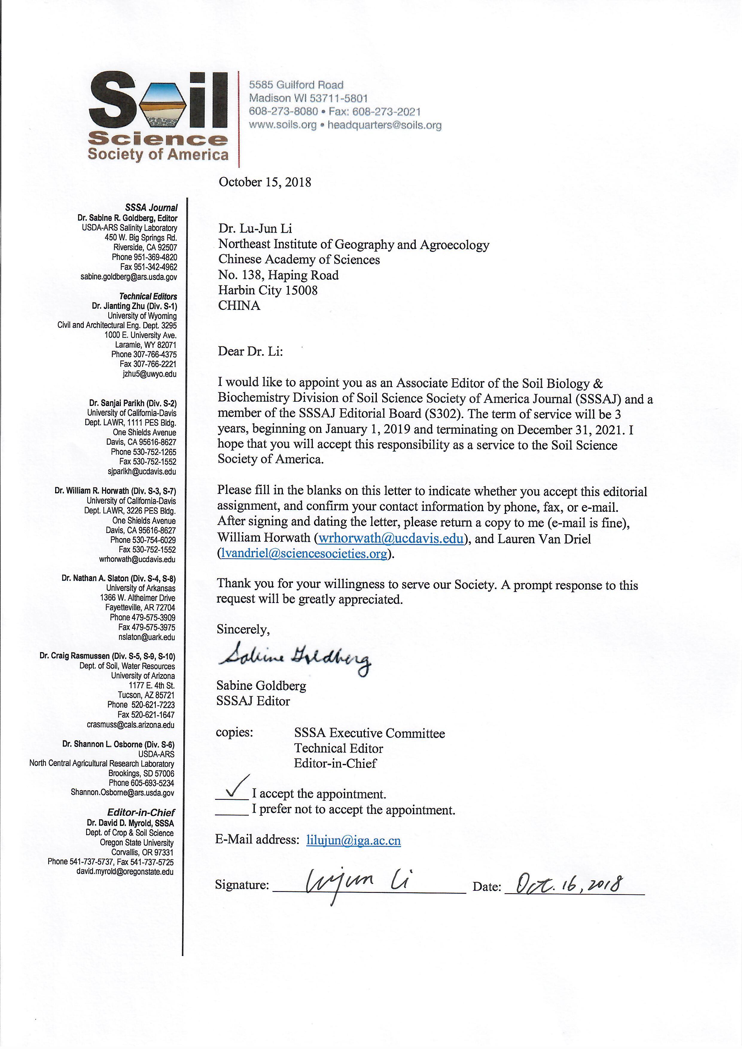 近日,中国科学院东北地理与农业生态研究所李禄军研究员收到了美国土壤学会会刊Soil Science Society of America Journal(SSSAJ)的正式邀请,担任该期刊的副主编(Associate Editor)和编委(S302),任期三年(2019年1月1日至2021年12月31日)。SSSAJ创刊于1976年,双月刊,2017-2018年影响因子为1.920,属土壤科学类经典期刊。该期刊致力于土壤科学最新研究成果的传播和推广,刊登原创性研究论文,专题论文,综述,评论和书评。主题包括应用于农田、森林、湿地和城市土壤的基础研究、应用研究及其拓展性研究。
