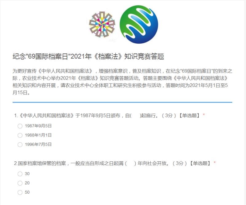 为普及《档案法》知识,提高职工对《档案法》的认识和了解,按照中科院档案馆关于宣传学习《档案法》的要求, “6月9日国际档案日”到来之际,5月1日-5月18日农业技术中心综合办公室举办《档案法》知识答题活动。