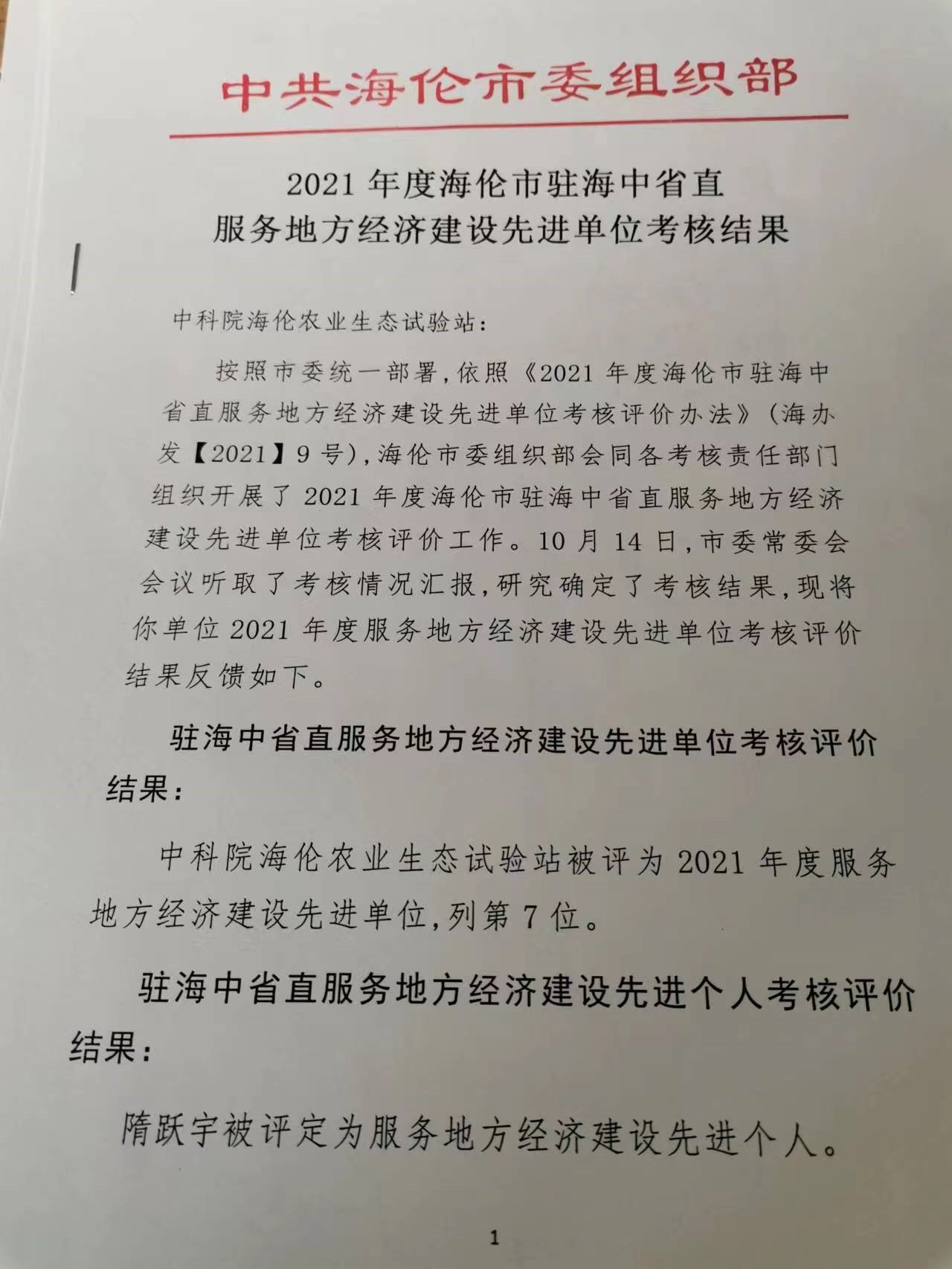 近日,海伦市委组织部组织开展了2021年度海伦市驻海中省直服务地方经济建设先进单位考核评价,海伦农业生态实验站(以下简称海伦站)被评为服务地方经济建设先进单位,海伦站常务副站长隋跃宇被评定为服务地方经济建设先进个人。
