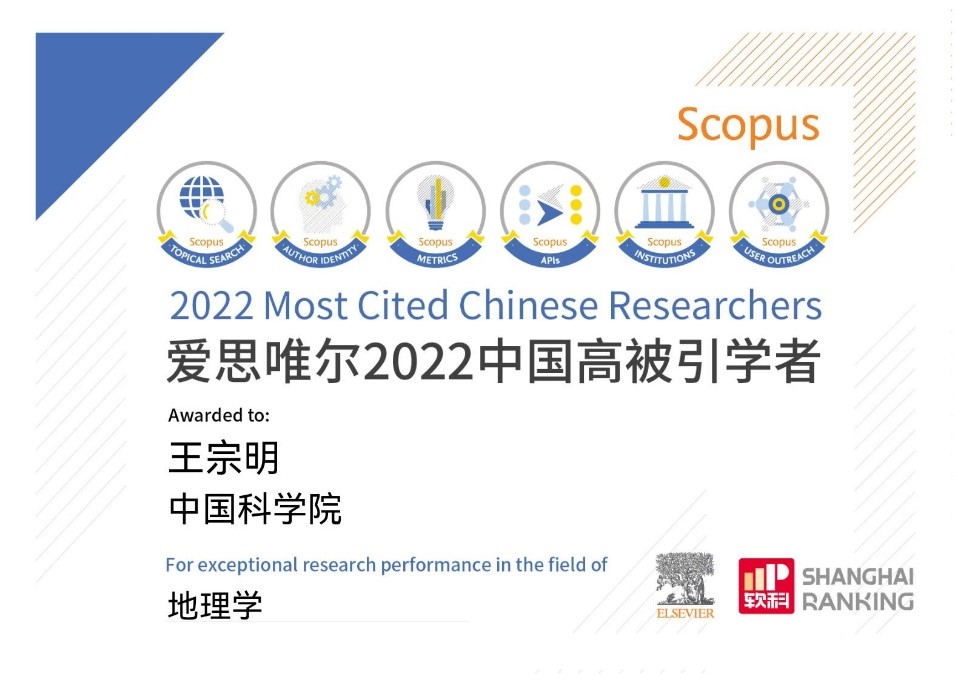 王宗明研究员入选Elsevier 2022“中国高被引学者”榜单
