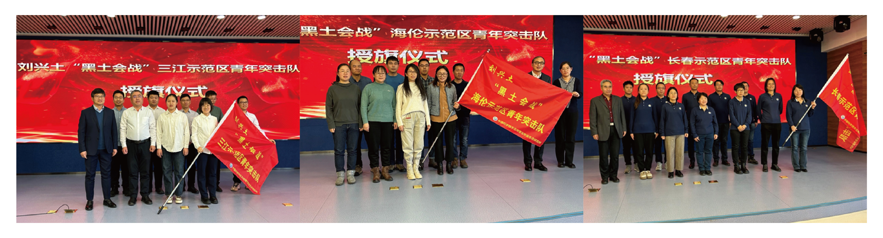 会上进行了刘兴土“黑土会战”三江示范区青年突击队、刘兴土“黑土会战”海伦示范区青年突击队、刘兴土“黑土会战”长春示范区青年突击队授旗仪式,三个青年突击队宣誓奋斗誓言。铮铮誓言体现了青年科技工作者为我国科技自立自强奋斗的坚定决心和信心。