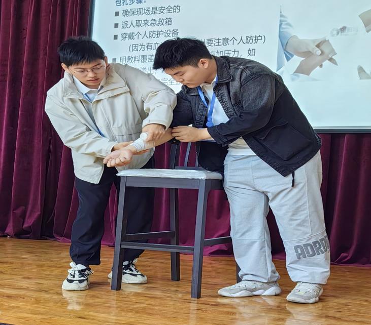 在实践操作方面,专业的急救老师与助教配合,借助道具为大家详细讲解了外伤伤口包扎、气道梗阻处理、心肺复苏、自动体外除颤仪(AED)使用等急救方法、操作手段及流程。随后同学们积极参与实际操练和巩固。
