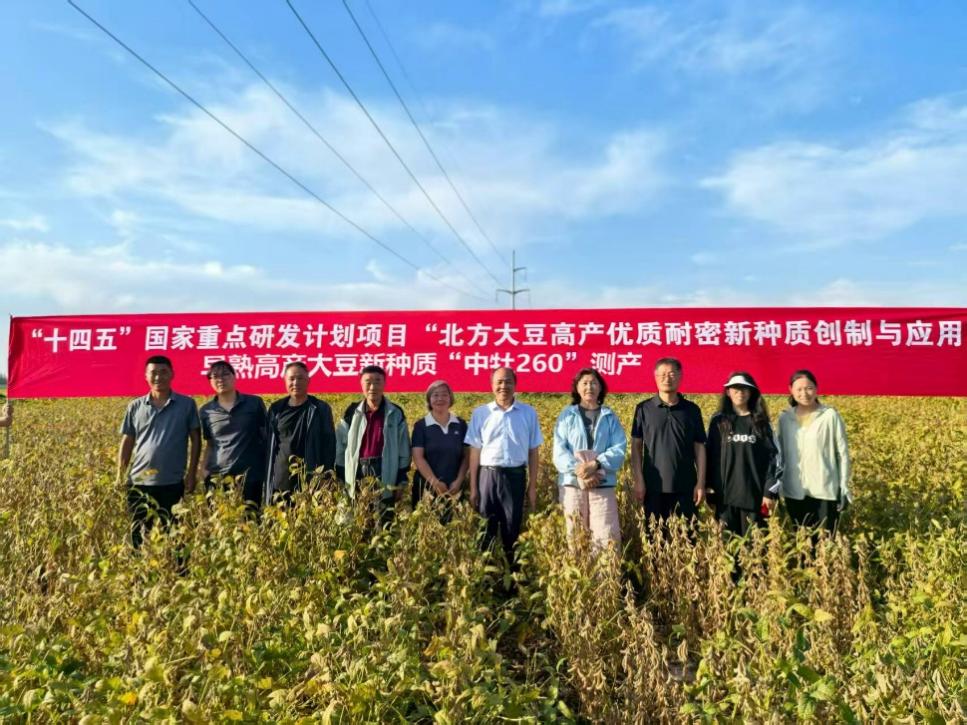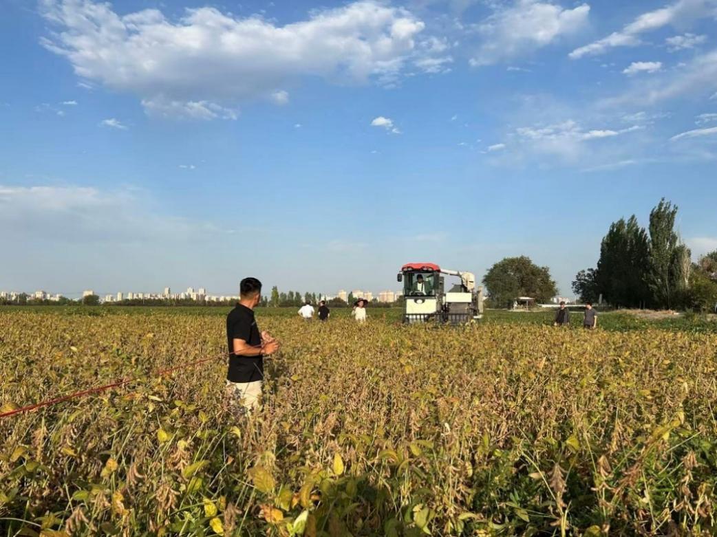 2025年8月30日,在新疆农垦科学院石河子基地,专家组对刘宝辉团队承担的“北方大豆高产新种质创制与应用项目中任务—早熟高产、理想株型种质创制”任务(2021YFD1201101-02)中理想株型种质“中牡260”(北豆40熟期组)小面积示范田进行测产。专家组由中国农业科学院油料作物研究所周新安研究员任组长、成员有新疆农垦科学院研究员战勇、新疆农业科学院研究员丛花、石河子大学教授刘峰、黑龙江省农业科学院牡丹江分院研究员任海祥。大豆育种专家杜维广研究员、国家重点研发计划项目负责人张淑珍教授、东北地理所大豆分子育种学科组翟红研究员等全程参加本次测产。