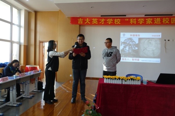 2017年11月24日下午,应吉大英才学校的邀请,我所崔明星博士为初中一年级学生做了题为“年轮的故事”主题科普报告。报告会由吉大英才学校校长王帮阁主持,王校长代表校方,为崔明星博士颁发了“科学导师”的聘书。英才学校120多名学生和老师参加了本次科普活动。