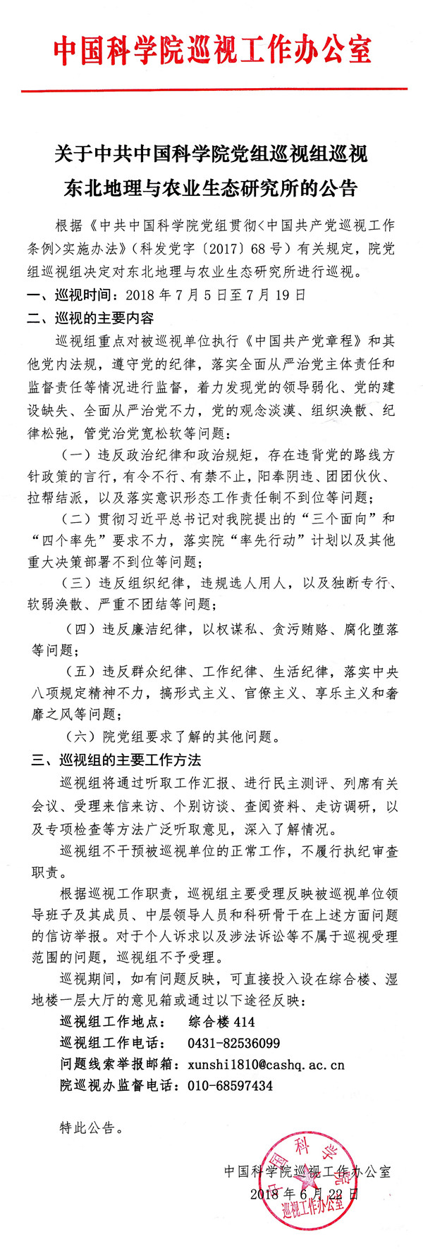 关于中共中国科学院党组巡视组巡视东北地理与农业生态研究所的公告